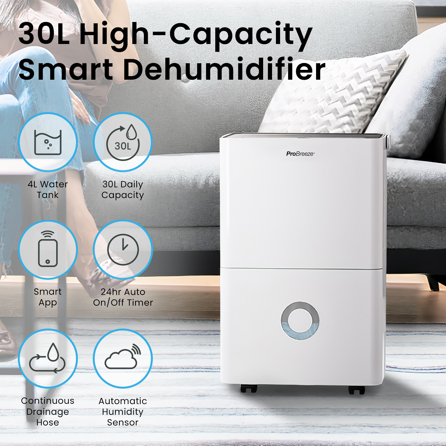Intelligent and powerful, the 30L Low Energy Smart Dehumidifier swiftly removes dampness, humidity, window condensation and mould build-up. Despite its impressive extraction power, it’s compact enough to fit seamlessly into any room. The standout feature? Full control from anywhere through the Pro Breeze smart app, giving you real-time updates and allowing you to adjust settings on the go.