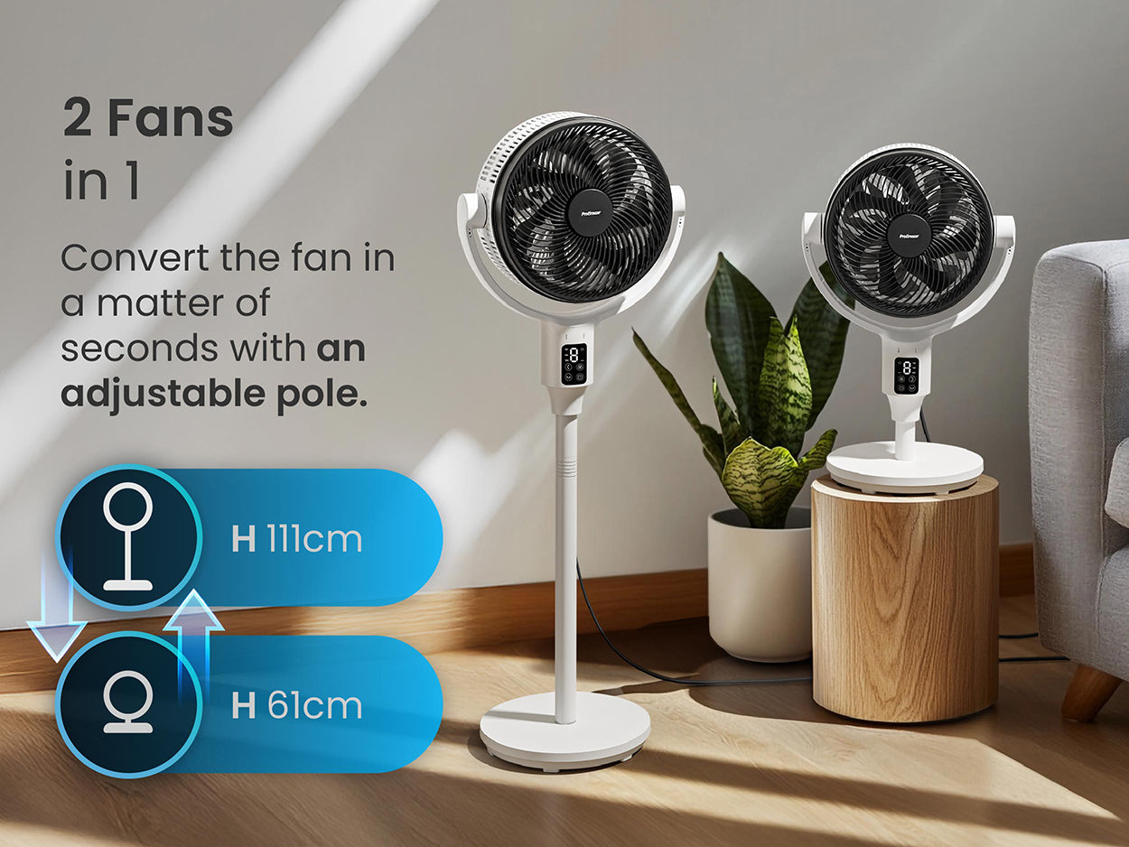 - Hybrid design: Switch between a standing or desk fan in seconds with the foldable pole – no tools or screws needed.