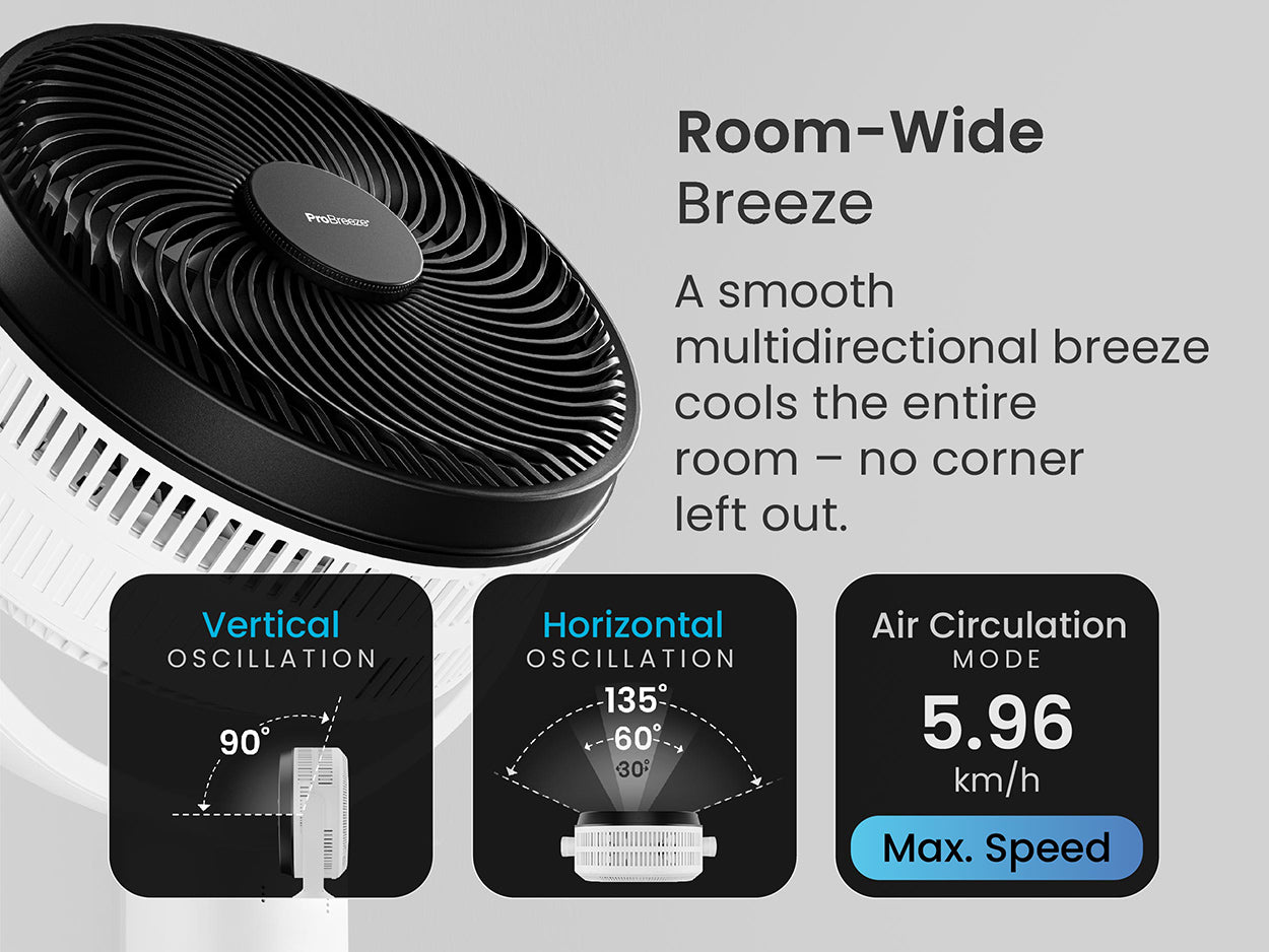 - Wraparound Breeze: At the touch of a button, the fan switches to multidirectional airflow (100° horizontal and 130° vertical) for a breeze that surrounds you.